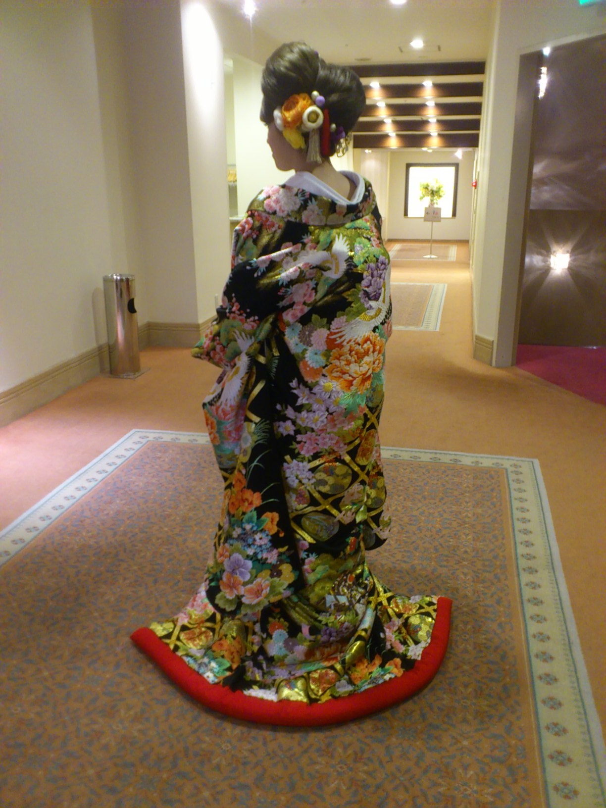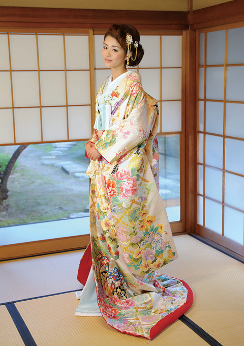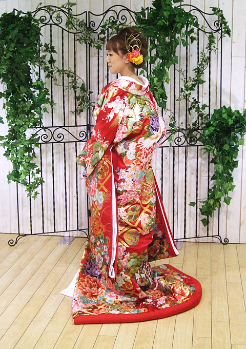 日本古来の伝統の松と、後ろの帯の位置にある鶴がポイントの打掛です![]()