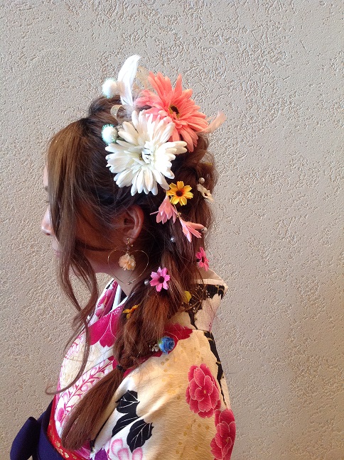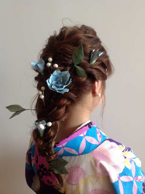 ロングの三つ編みにお花をさしたヘアースタイル